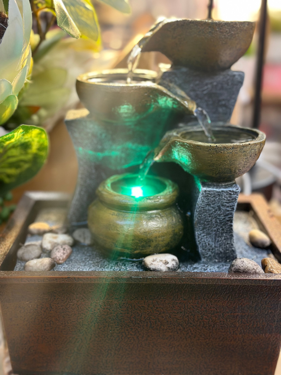 Enjoy the tranquility of our ceramic tabletop indoor spa fountain. Using this spa fountain promises to create a relaxing environment and an attractive feature for your home decor. Easy assembly, put the tube through the opening on the fountain, fill the bottom with water, place the water pump in the water at the bottom of the fountain, and plug the 6 foot long power cord into the outlet in the wall. (120V). Caution, be sure to monitor the water level. Do not overflow the water. Be sure the water maintains water above the pump to ensure it does not burn out. Once the fountain is on, enjoy the different colors. We include some waterfall rocks to add to the decor of the fountain. These may be placed on the base of the fountain.